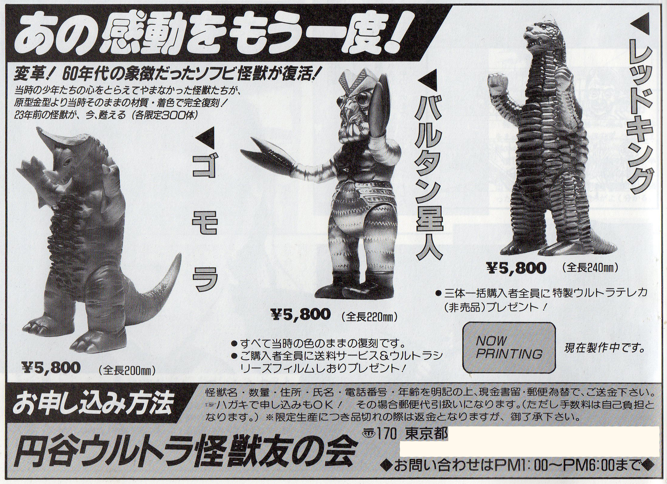 マルサン商店の金型(足裏にマルサン刻印)が使用された、この復刻ソフビのラインナップは、レッドキング、バルタン星人、ゴモラの3種類。手元に残っている当時の広告によると、発売開始は1989年2月頃、販売方法は通信販売が中心で、定価5,800円。各300個限定で、3体同時購入すると、特性ウルトラテレカ(非売品)が、プレゼントされたそうです。