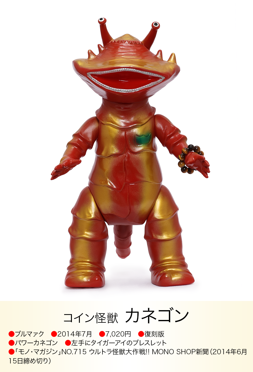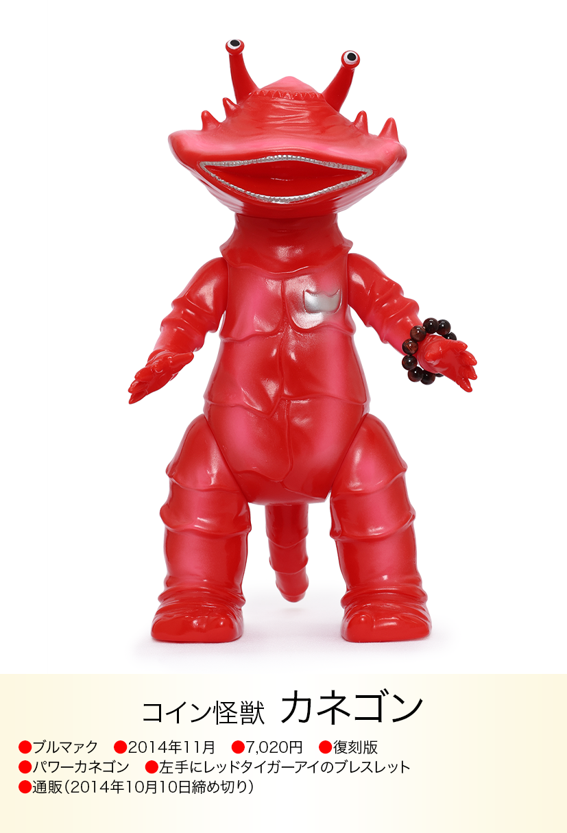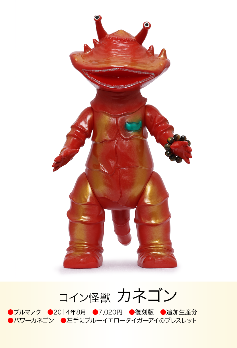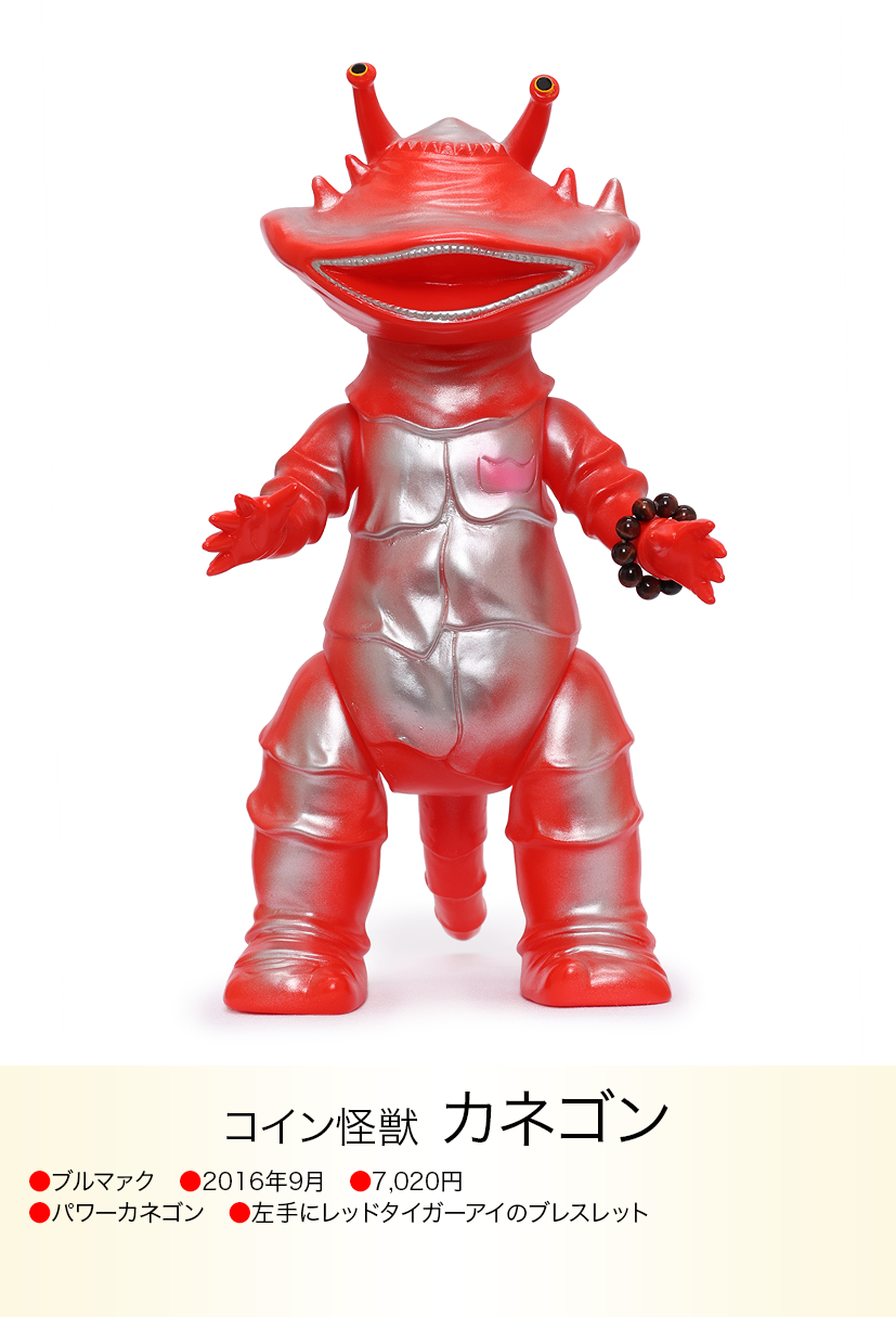 コイン怪獣 カネゴンが金運の石といわれるタイガーアイのブレスレットを左手に着けた異色コラボが、「モノ・マガジン」NO.715で紹介され、怪獣ソフビとパワーストンの思いも寄らない組み合わせが、怪獣ソフビを集めている人以外にも驚くほど人気が爆発、何度も色変えのバリエーションが発売されたブルマァクの「パワーカネゴン」。その後もラッキーピグモン、ハッピーブースカなど『ブルマァクのパワーストーンシリーズ』として、さまざまな怪獣とパワーストーンの組み合わせが発売されました。ラッキーナメゴンはパワーストーンの首飾りに一個金色の玉が入り、劇中のナメゴンが生まれる金色の卵を連想させる遊び心もあり怪獣好きを楽しませてくれました。