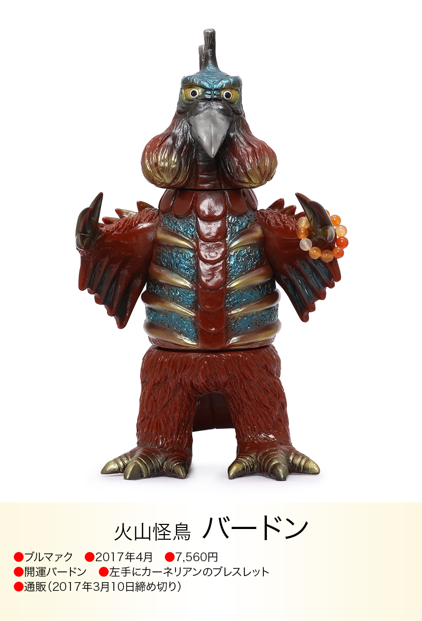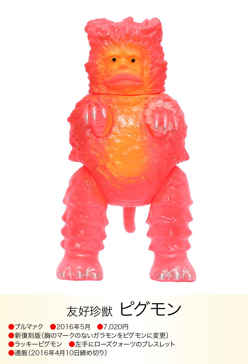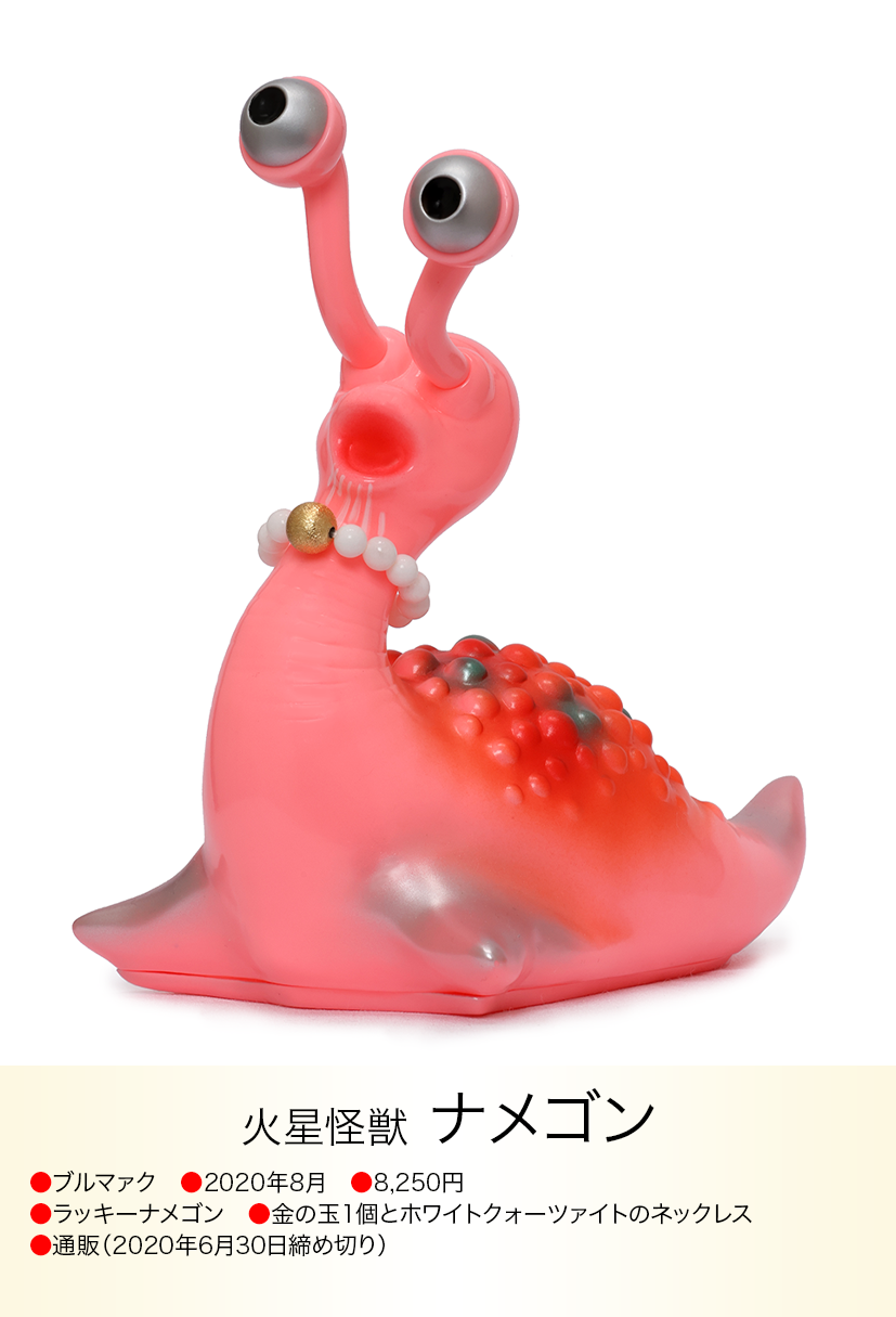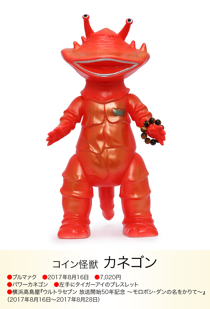 コイン怪獣 カネゴンが金運の石といわれるタイガーアイのブレスレットを左手に着けた異色コラボが、「モノ・マガジン」NO.715で紹介され、怪獣ソフビとパワーストンの思いも寄らない組み合わせが、怪獣ソフビを集めている人以外にも驚くほど人気が爆発、何度も色変えのバリエーションが発売されたブルマァクの「パワーカネゴン」。その後もラッキーピグモン、ハッピーブースカなど『ブルマァクのパワーストーンシリーズ』として、さまざまな怪獣とパワーストーンの組み合わせが発売されました。ラッキーナメゴンはパワーストーンの首飾りに一個金色の玉が入り、劇中のナメゴンが生まれる金色の卵を連想させる遊び心もあり怪獣好きを楽しませてくれました。