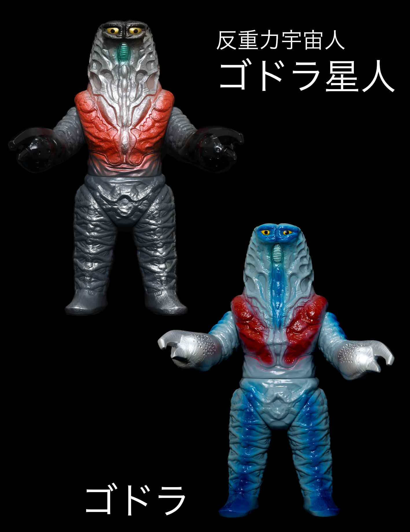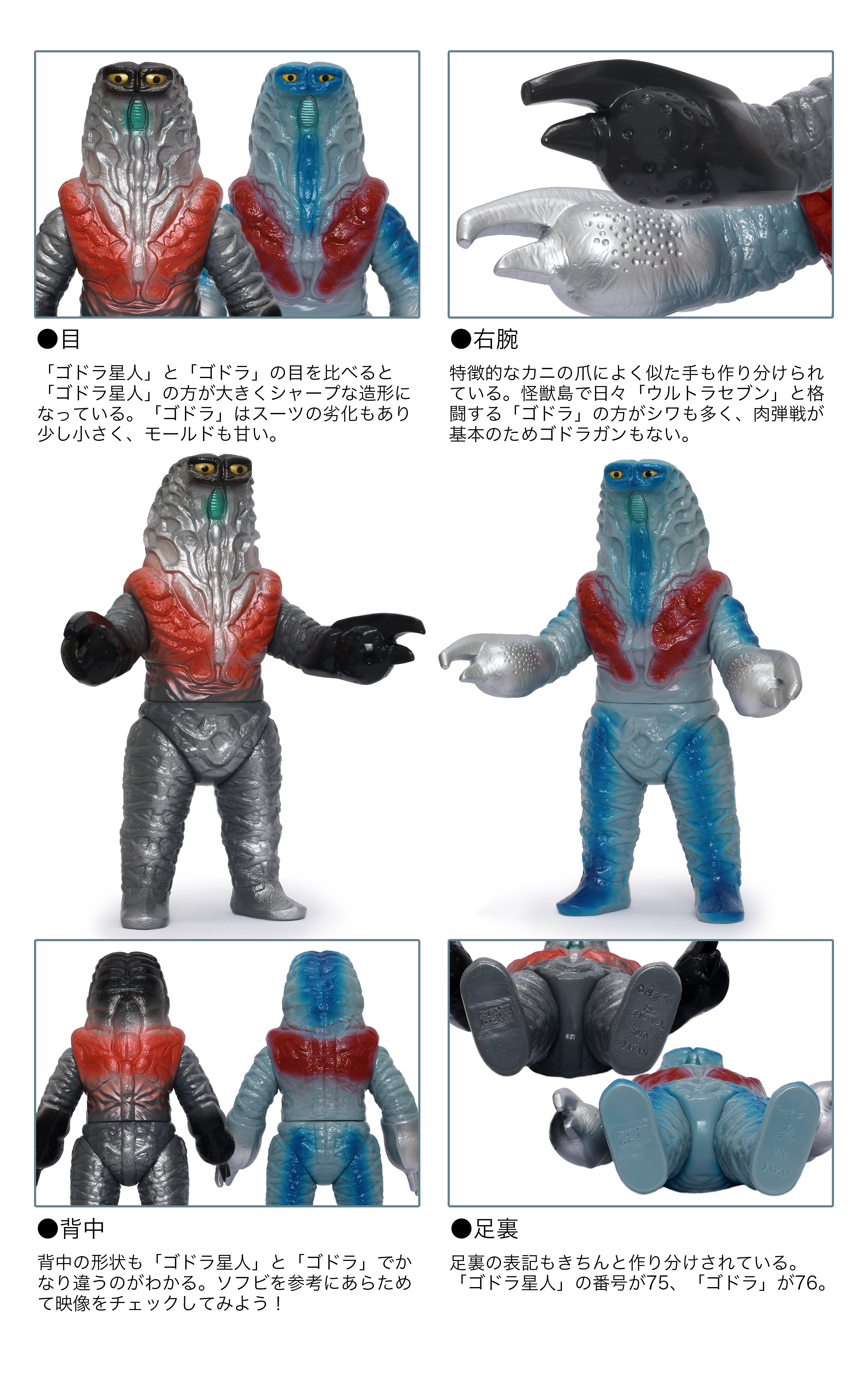やまなや『怪獣郷』シリーズのゴドラ星人とゴドラは、色替えでキャラクターを変更したのではなく、右足以外はすべて別の造型になっている。これは円谷プロダクションでスーツアクターや商品監修担当としてホンモノに接してきた山名昭久氏だから再現できたこだわりの造型。今回詳しく比較してみました。ゴドラ星人やゴドラ以外の『銀河連邦』や『怪獣郷』シリーズも山名氏のこだわりがいたるところに表現されている。ぜひほかのソフビもじっくり観察して欲しい。