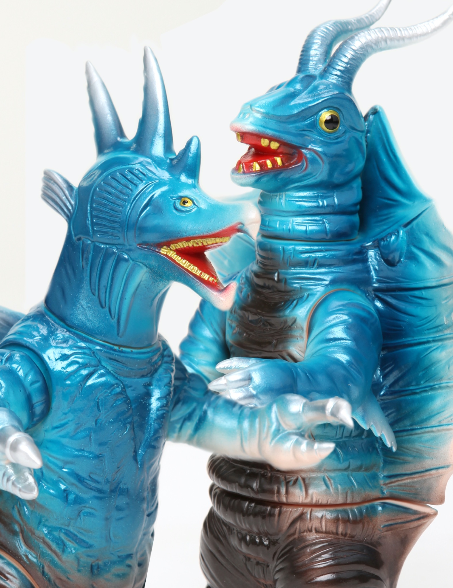 『帰ってきたウルトラマン』放送当時、ブルマァクより発売された、ムルチとキングマイマイの腕は、なぜか入れ替わった状態(ムルチにキングマイマイの腕、キングマイマイにムルチの腕)で、商品化されていました。これは、金型製造時に両方の腕を入れ間違えてしまったために起こった事故によるものです。当時子供だった私は、ムルチを持っていたのですが「ムルチは、こんな手じゃないよな」と軽い気持ちで遊んでおりました。もし私がキングマイマイも持っていたら、入れ替わっている事に気がついたでしょうか?実は、ここにもう一つ思わぬ間違いが起きていたのです。それは、ムルチのために造形された両腕が着ぐるみとまったく違う五本指造形になっていたのです。それこそ両方のソフビを持っていたら、ますます「??」になっていたかもしれません。ブルマァク怪獣の人気絶頂期におこった『入れ間違い事件』として、今では伝説となっているこの二体のソフビは、これまで一度も入れ間違った状態で復刻されていなかったのです。今回のムルチとキングマイマイは、『帰ってきたウルトラマン』40周年記念として、初の入れ間違いバージョンでの復刻です。それもムルチは、みなさんからの復刻希望が多かったカタログカラー!!キングマイマイも腕を入れ替えて遊べるように、今回は同じスプレーカラーで仕上げています。大人の遊び心がいっぱい詰まった、これこそ本物のブルマァク復刻版といえるムルチとキングマイマイ、大切なコレクションの一員に加えてください。