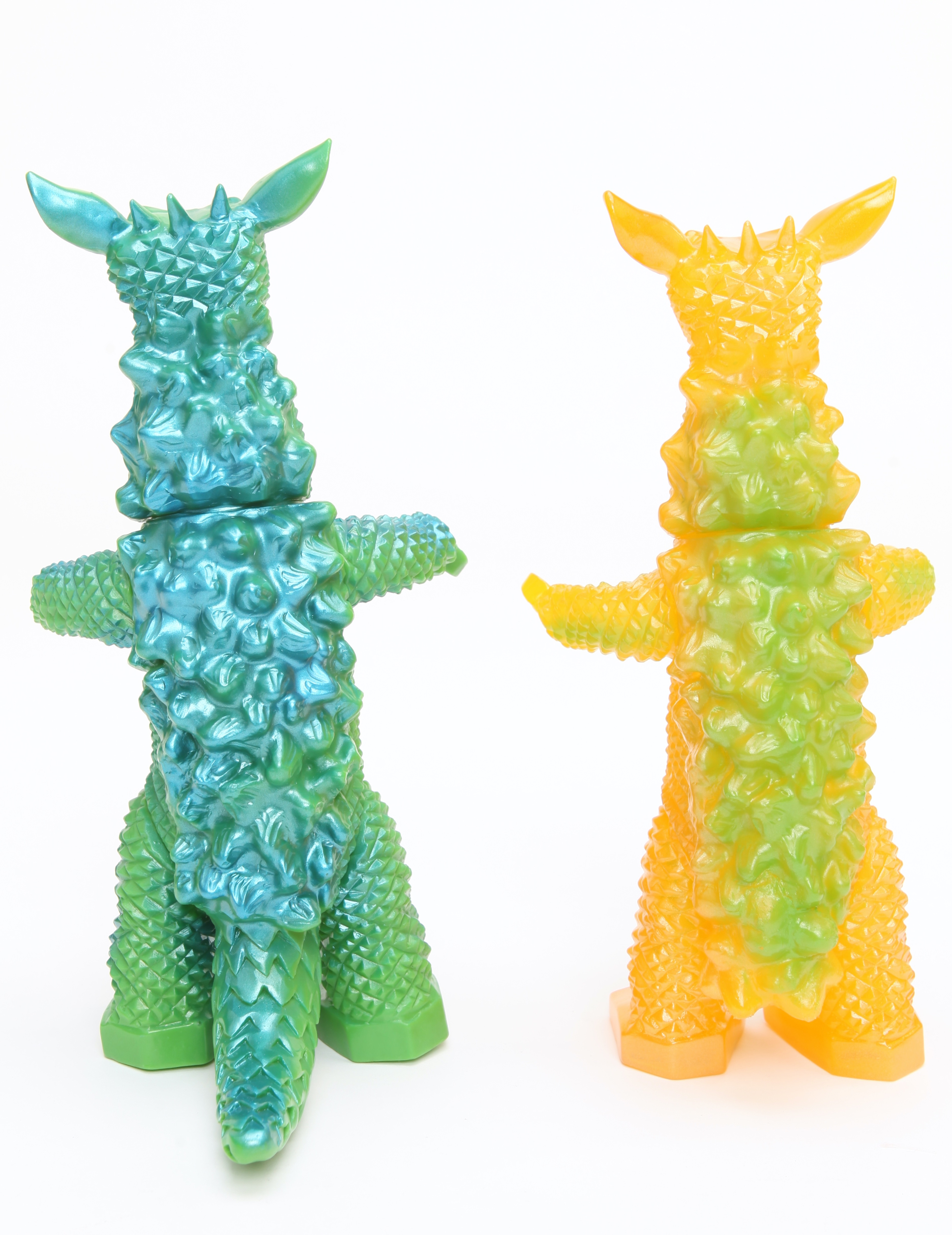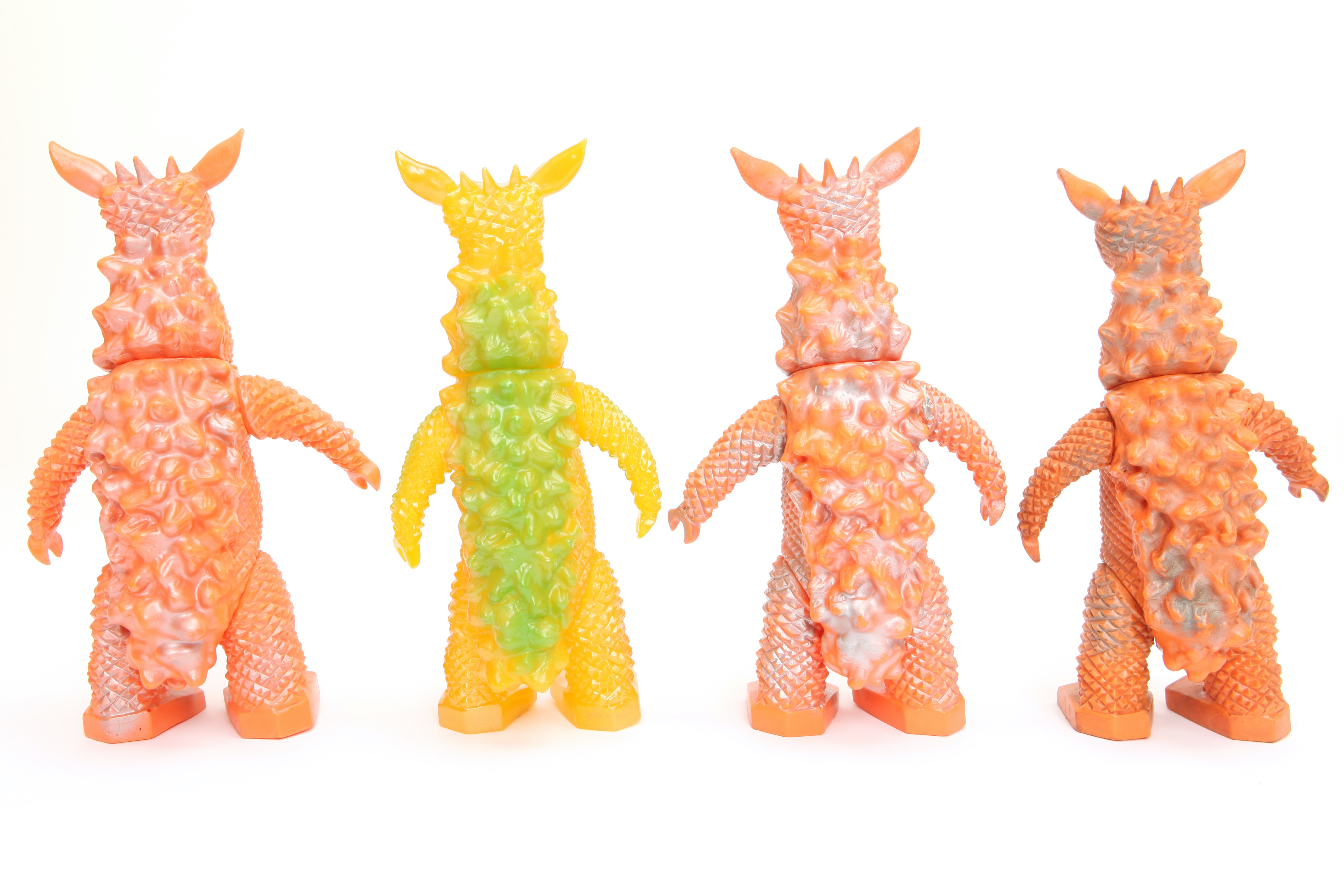 今年2月に発売されたギャンゴ(ダメージ版)から、尻尾が無いバージョンに変わっていたことに気がついていましたか?それまでブルマァク復刻版として発売されたギャンゴには、劇中のギャンゴや当時発売されたオリジナルのソフビ人形に無い、長い尻尾が付いていました。ではなぜ長い尻尾のギャンゴが存在したのでしょうか?それは放送当時作った原型になぜか間違った長い尻尾があり、その原型から元型が作られ、そこから生産型が作られた段階で尻尾の間違いに気がつき、生産型を改修し、オリジナルソフビは発売されました。復刻版は改修されていない元型から作られたため、最初の原型にあった長い尻尾が付いていたのです。今回発売されるギャンゴは、尻尾の無い状態の金型を新たに作成し、オリジナルと同じバージョンの初復刻版となります。(2015年2月発売版はダメージ版のため頭部がオリジナルと違う)ぜひコレクションの一つに加えてください。