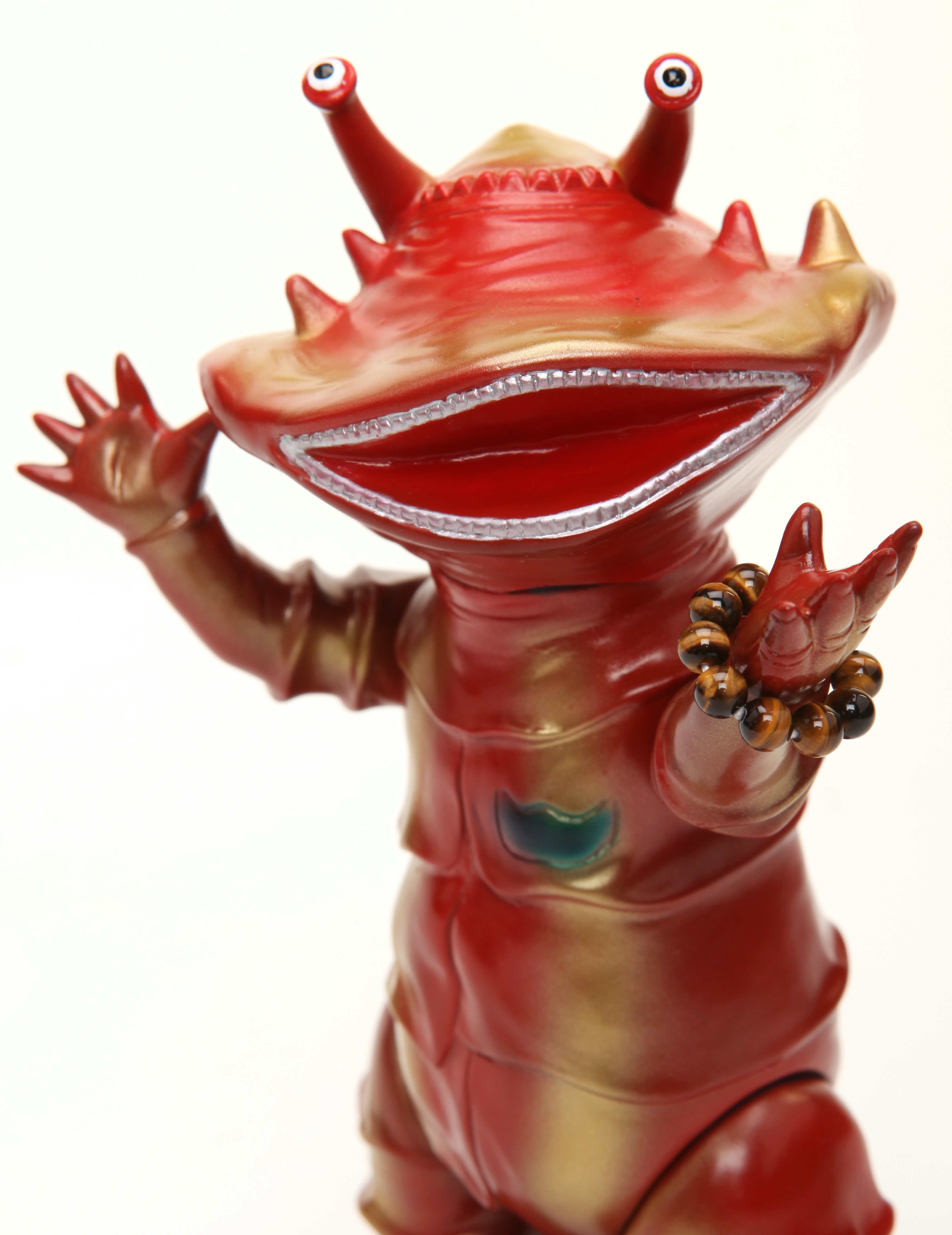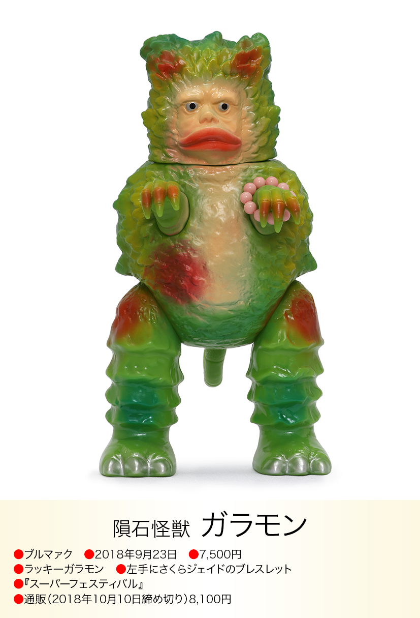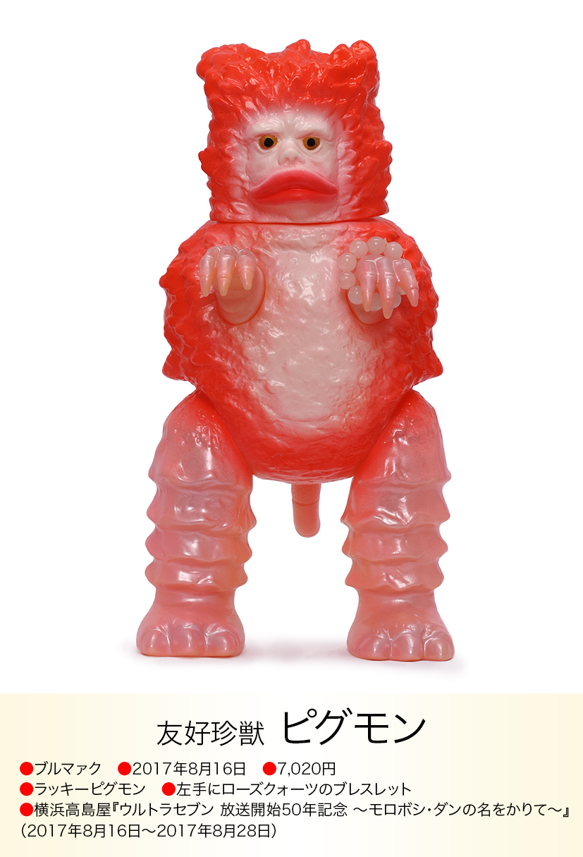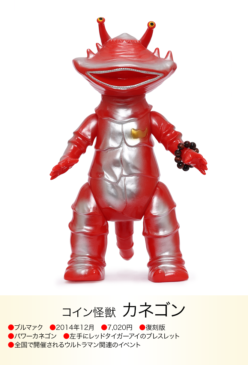 コイン怪獣 カネゴンが金運の石といわれるタイガーアイのブレスレットを左手に着けた異色コラボが、「モノ・マガジン」NO.715で紹介され、怪獣ソフビとパワーストンの思いも寄らない組み合わせが、怪獣ソフビを集めている人以外にも驚くほど人気が爆発、何度も色変えのバリエーションが発売されたブルマァクの「パワーカネゴン」。その後もラッキーピグモン、ハッピーブースカなど『ブルマァクのパワーストーンシリーズ』として、さまざまな怪獣とパワーストーンの組み合わせが発売されました。ラッキーナメゴンはパワーストーンの首飾りに一個金色の玉が入り、劇中のナメゴンが生まれる金色の卵を連想させる遊び心もあり怪獣好きを楽しませてくれました。